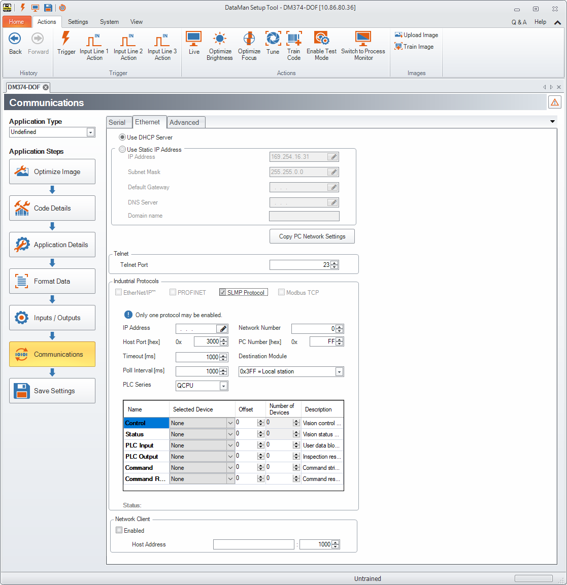 By default, SLMP Protocol is not enabled on the DataMan reader. The protocol must be enabled and the protocol configuration parameters must be set to correctly interact with a PLC. Protocol configuration is accomplished via the DataMan Setup Tool.