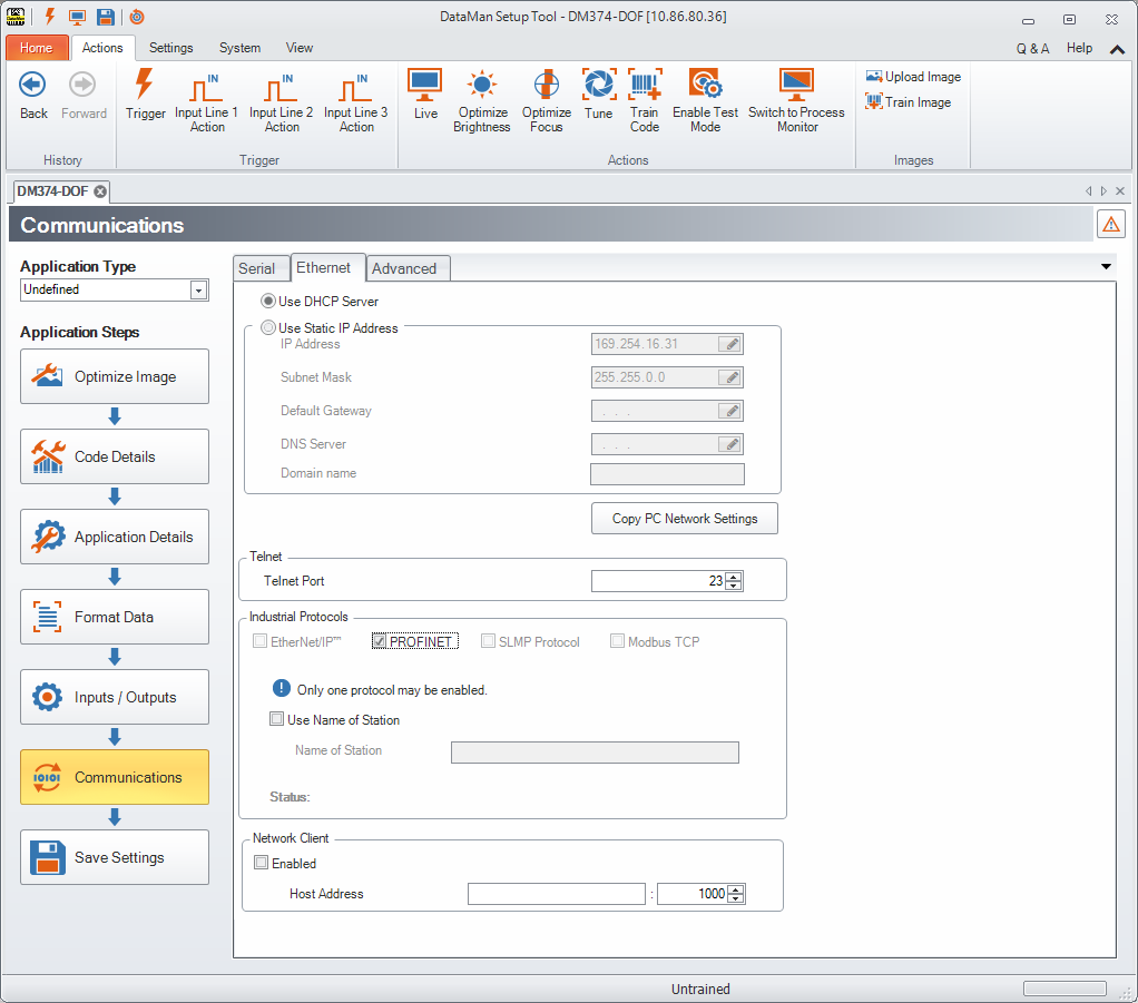 By default, the DataMan has the PROFINET protocol disabled. The protocol can be enabled via DMCC, scanning a parameter code or in the DataMan Setup Tool.