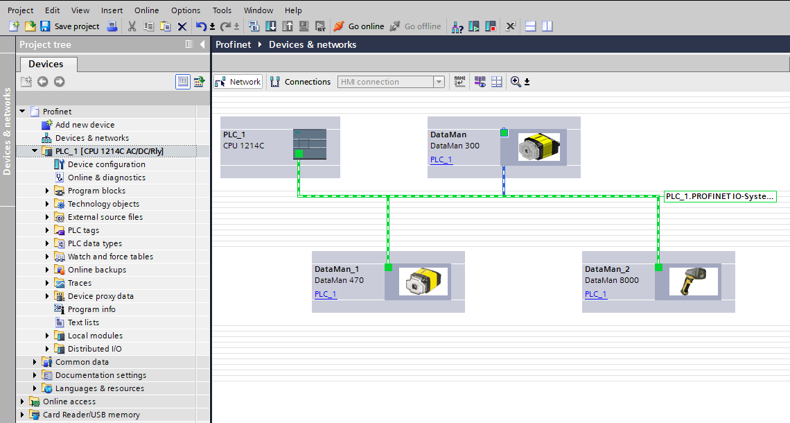 - Press and hold the left mouse button to drag the DataMan reader and drop it on the PROFINET IO network symbol in the left pane.