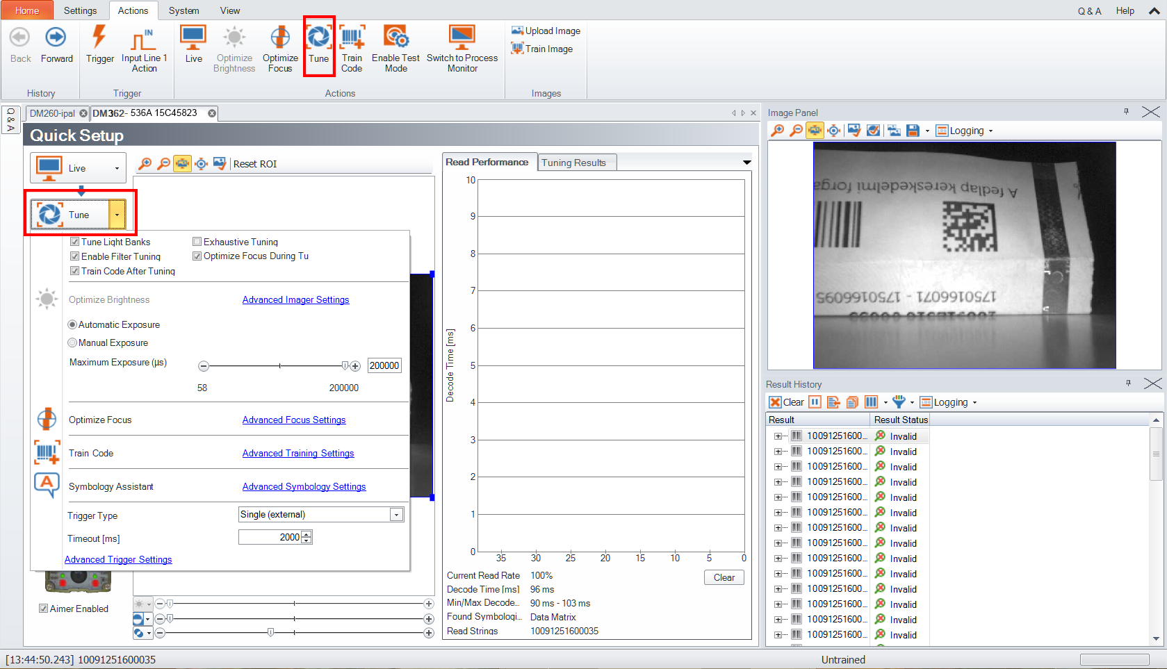 - Start tuning by sending a DMCC, for more information, see the DataMan Control Commands Documentation, available through the Windows Start menu or the DataMan Setup Tool Help menu.