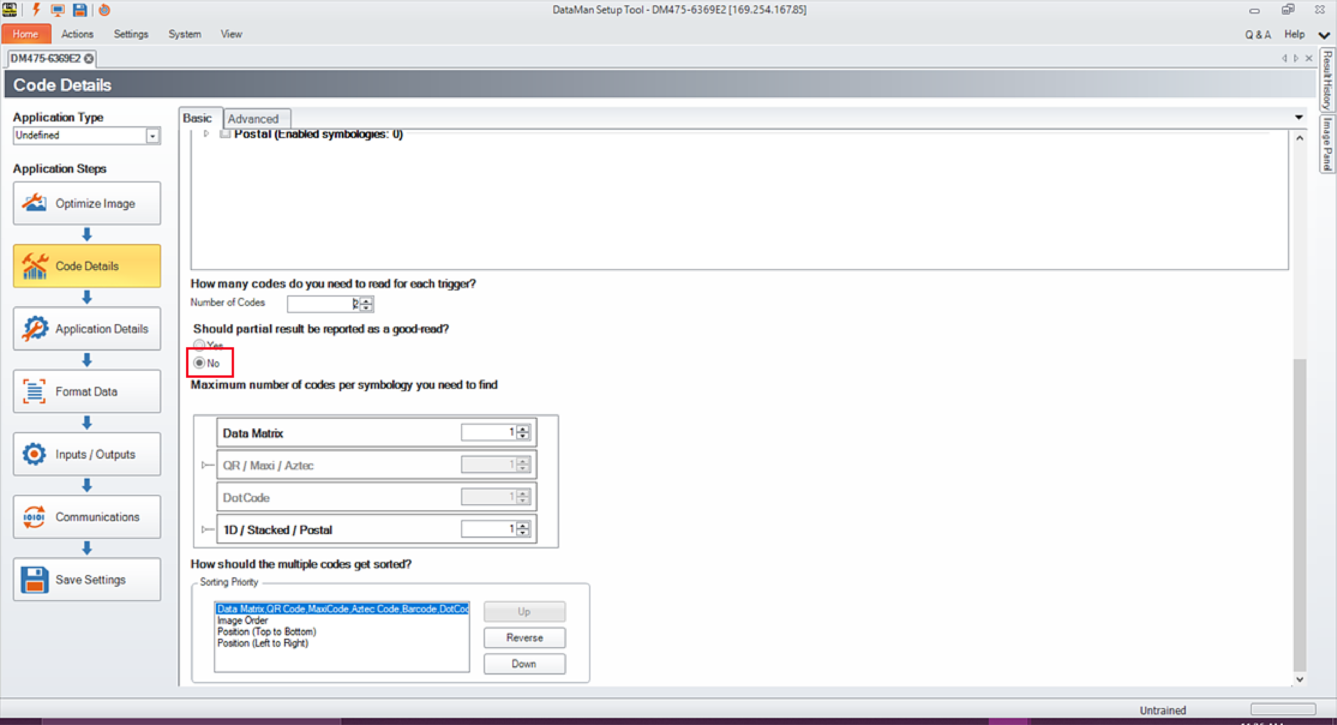 Note: Refer to DataMan Setup Tool Reference manuals if you have trouble connecting. - Select Code Details from the Application Steps in Setup Tool.