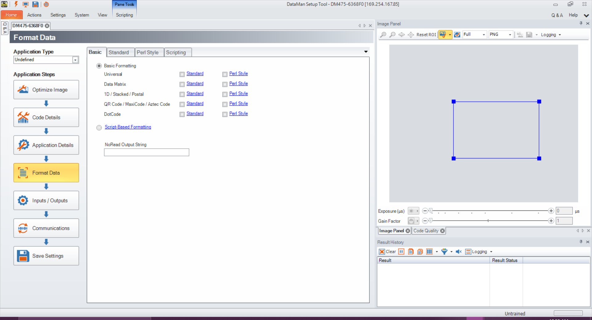 Click Result Type to open the Basic tab in the Format Data application step in Setup Tool. Select Script-Based Formatting to enable scripting for export of verification data to CSV or to custom, script-defined format.