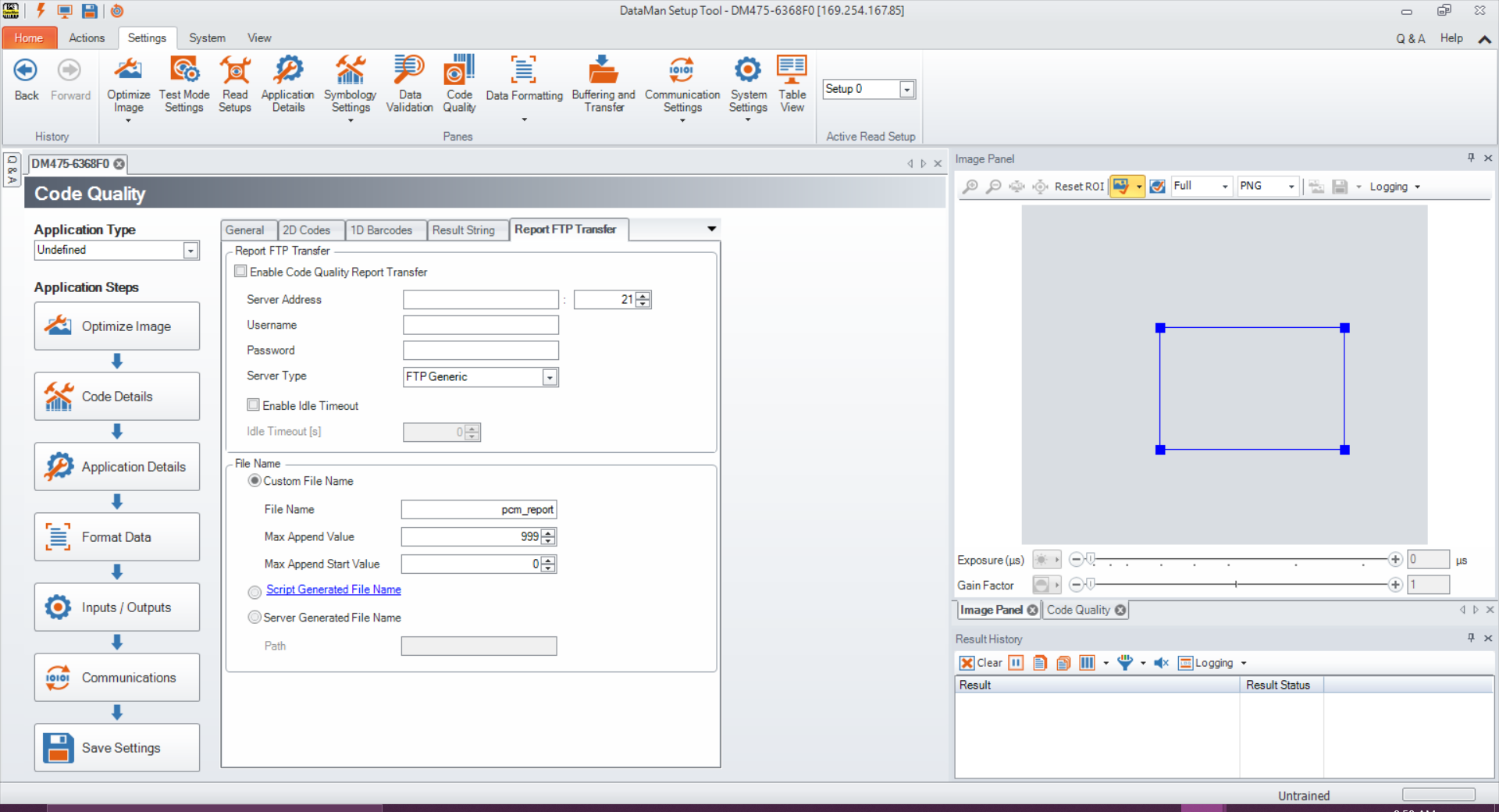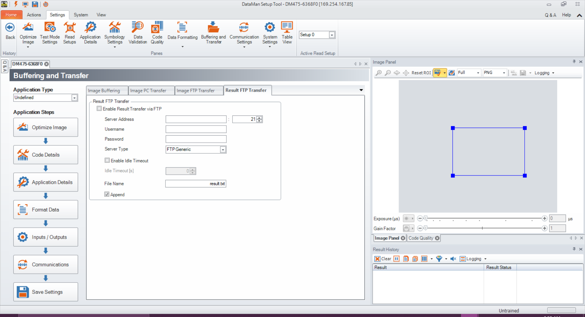 Click Result FTP Settings to open the Result FTP Transfer tab in the Format Data pane in Setup Tool. Enter information in this window to export verification results via FTP transfer.