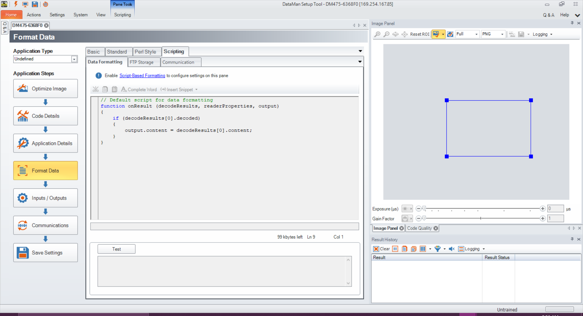 Click Result Formatting/Scripting to open the Scripting tab in the Format Data application step in Setup Tool. Create a script for outputting results or load a pre-written snippet in this window.