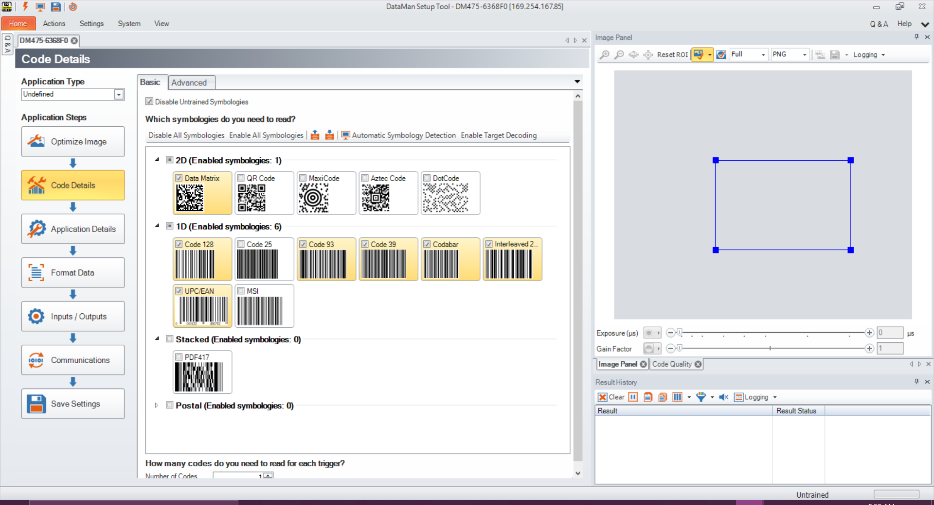 Select Symbologies/Number of Symbols to open the Basic tab in the Code Details application step in Setup Tool. Enable or disable any symbology types and enable multiple verification in this window.