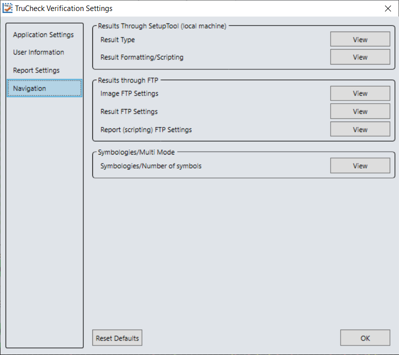 The Navigation menu allows you to access certain options in the Setup Tool window to configure exporting results either through Setup Tool or FTP. The Navigation menu also provides a shortcut to enable or disable symbologies and to set up the verifier to verify multiple symbols in one verification. Click the View button to re-direct Setup Tool to the settings of each reporting option.