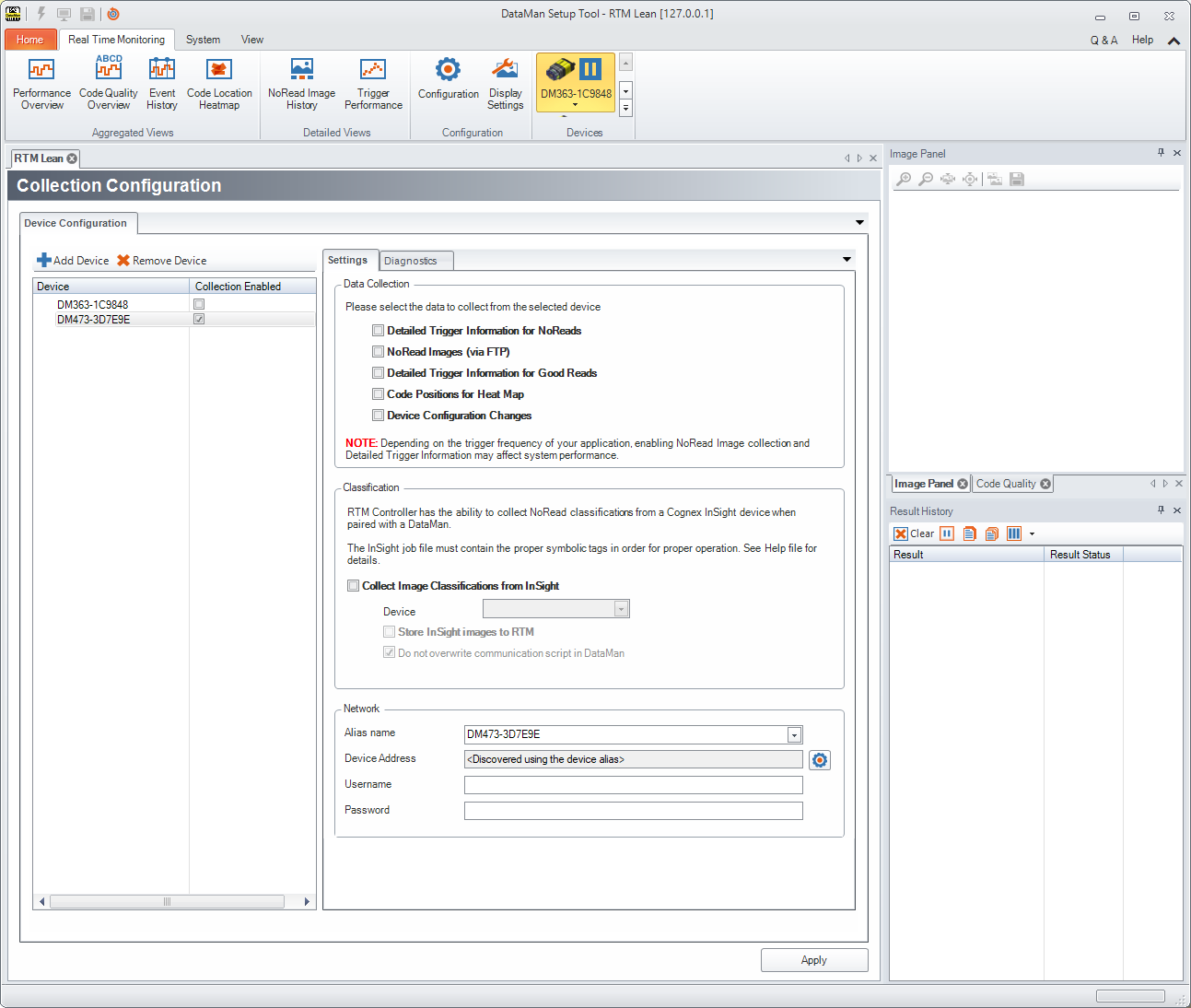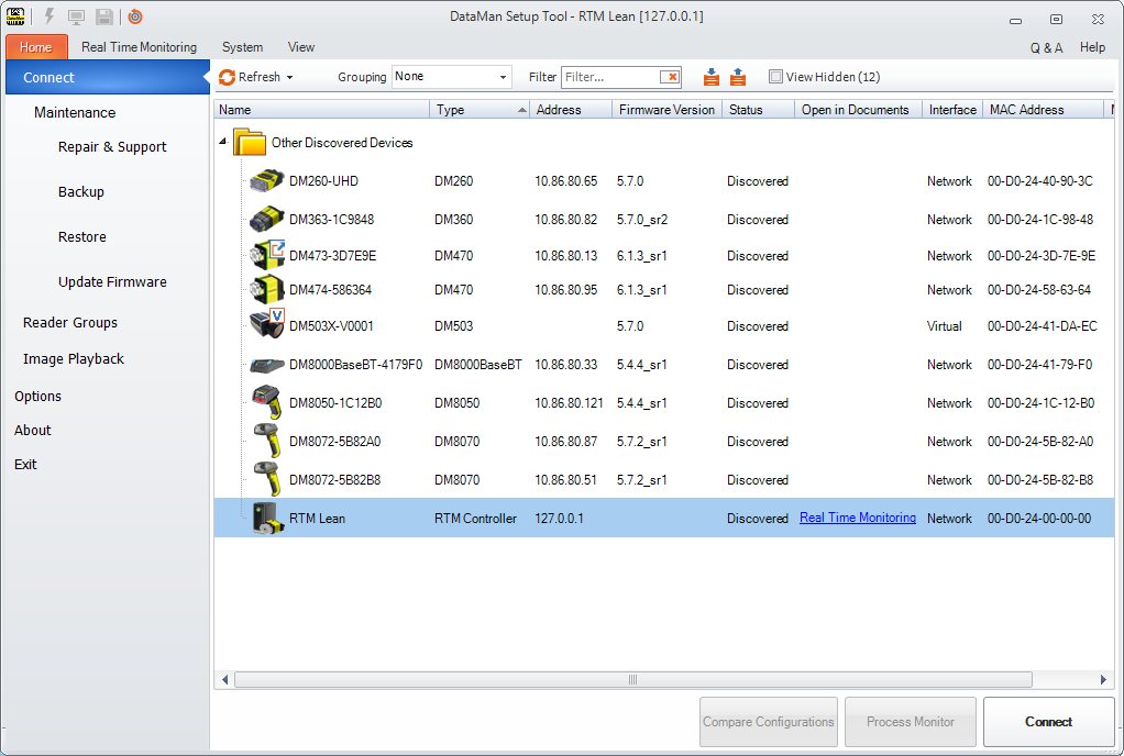 Real Time Monitoring (RTM) Lean is a feature built into the DataMan Setup Tool that allows for the collection and analysis of different kinds of data. RTM Lean collects data of devices on the network and displays this data in graphs. Connect to RTM Lean as a regular device on the Connect page.