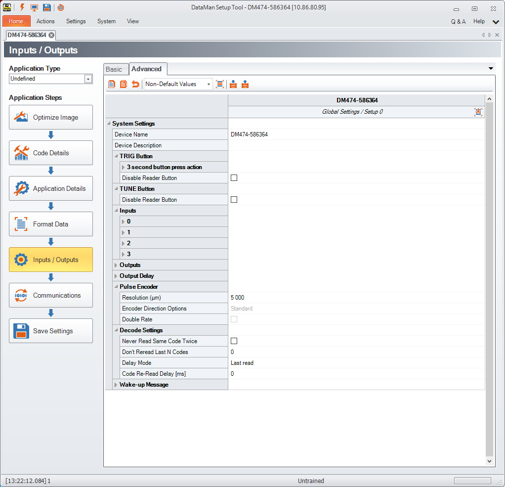 The Advanced tab provides you with a table-style view of the settings you can configure on the Basic tab. In addition to setting the device name and description, you can configure the TRIG Button, the TUNE Button, Input and Output lines, Output Delay, and a Pulse Encoder.