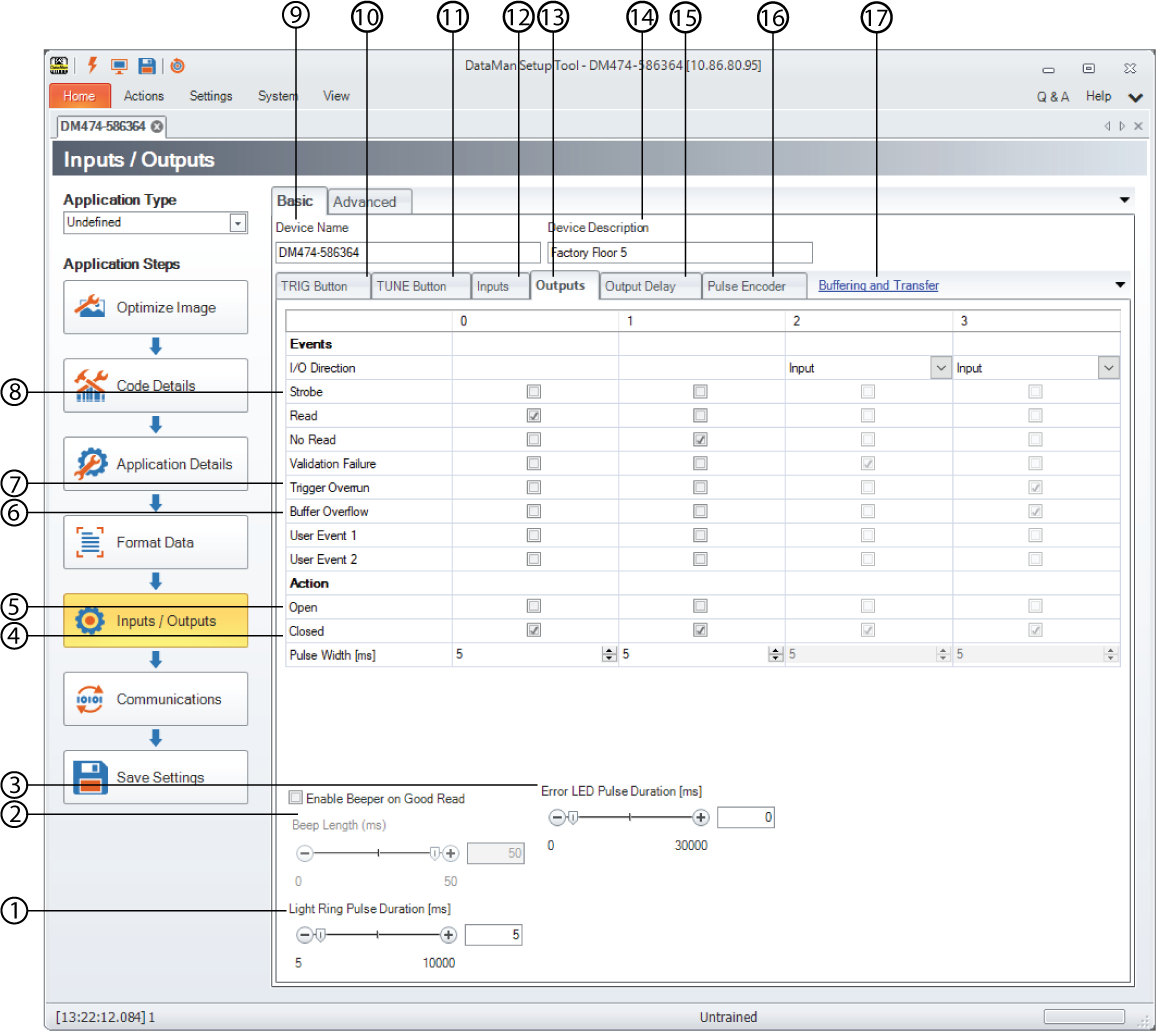 | 13 | Outputs | The Outputs tab lets you configure the behavior of all output lines available to the reader. For any line you can configure the event and action of the output line. |
