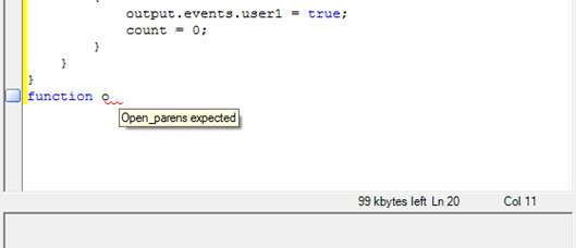 Scripting errors may occur when the script is loaded or the code parser function is called. These errors are shown in the following locations: