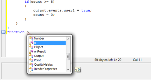 The script editor features automatic code completion, which shows pop-up messages with information regarding the code that is being written. Pop-up messages usually appear when typing special characters, for example period, opening or closing brackets, and so on. These messages can also be used manually with the Ctrl+Space key combination.
