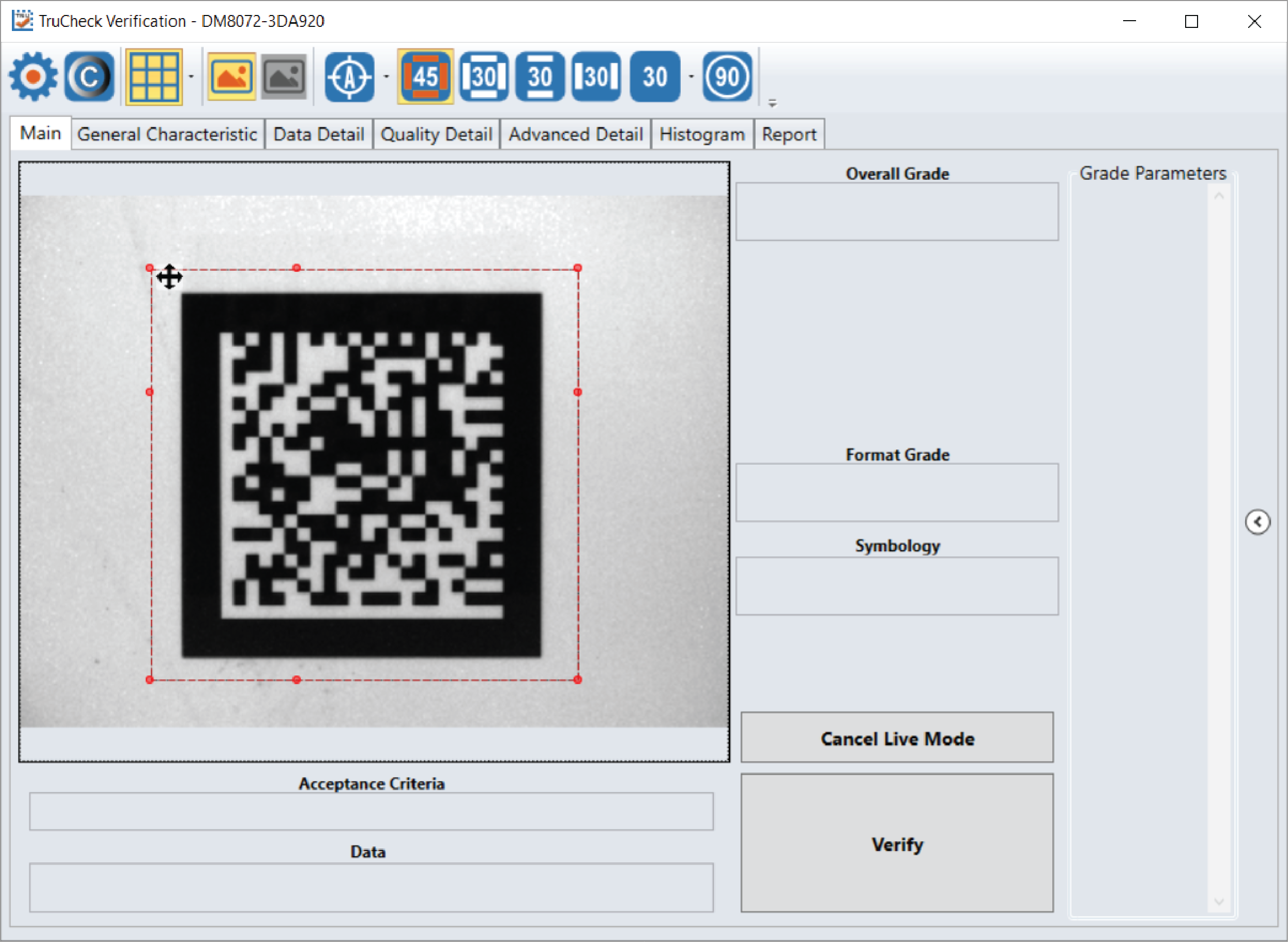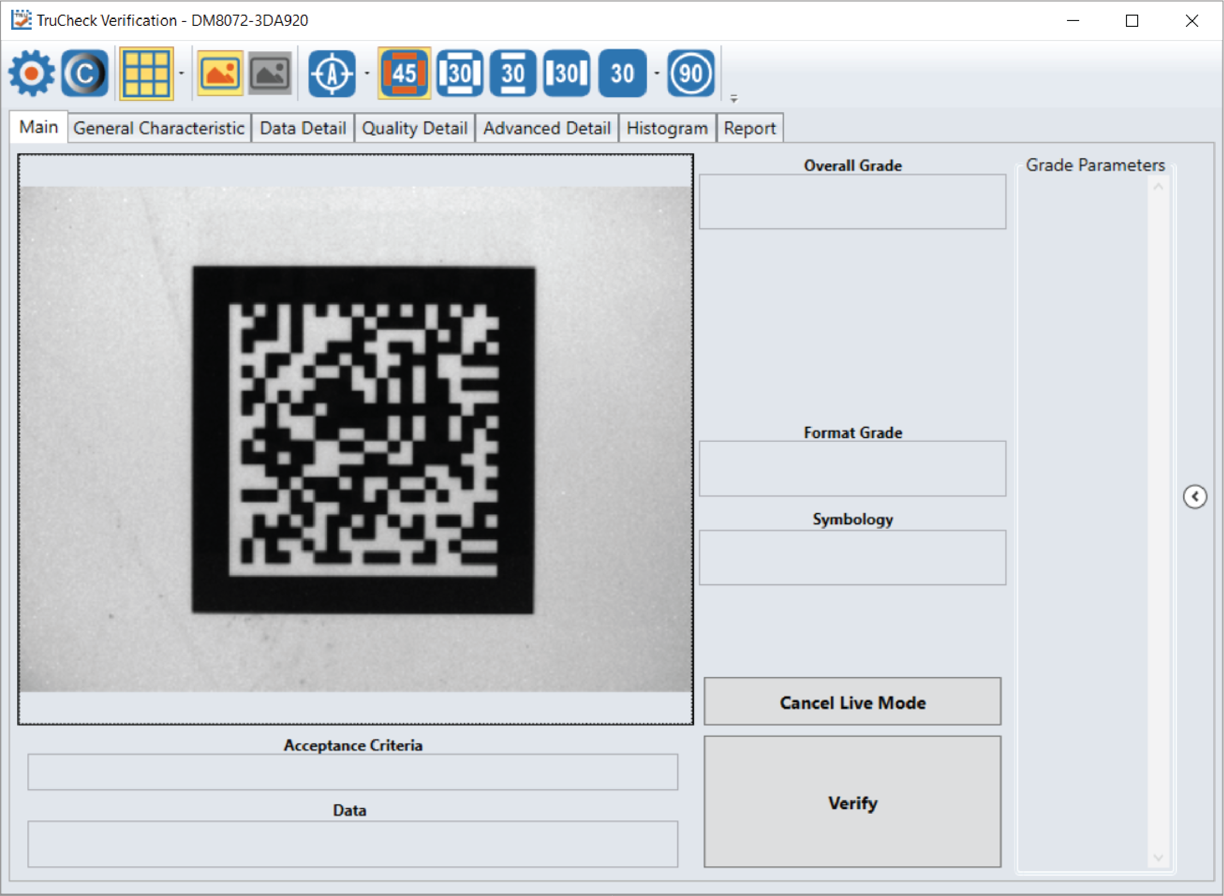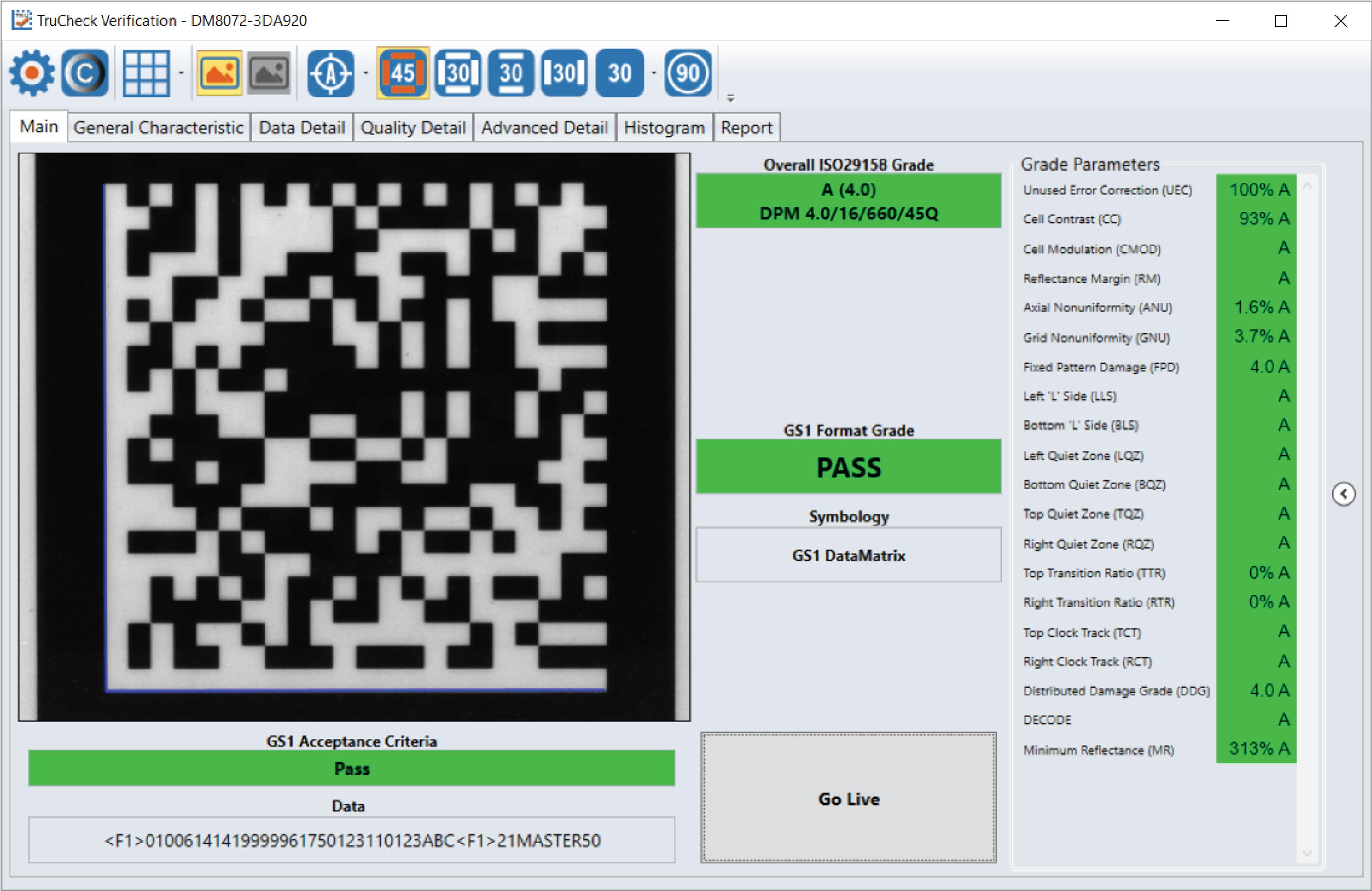 Note: The following screenshot shows a successful 2D barcode verification. Depending on grading and application standards, additional details are displayed.