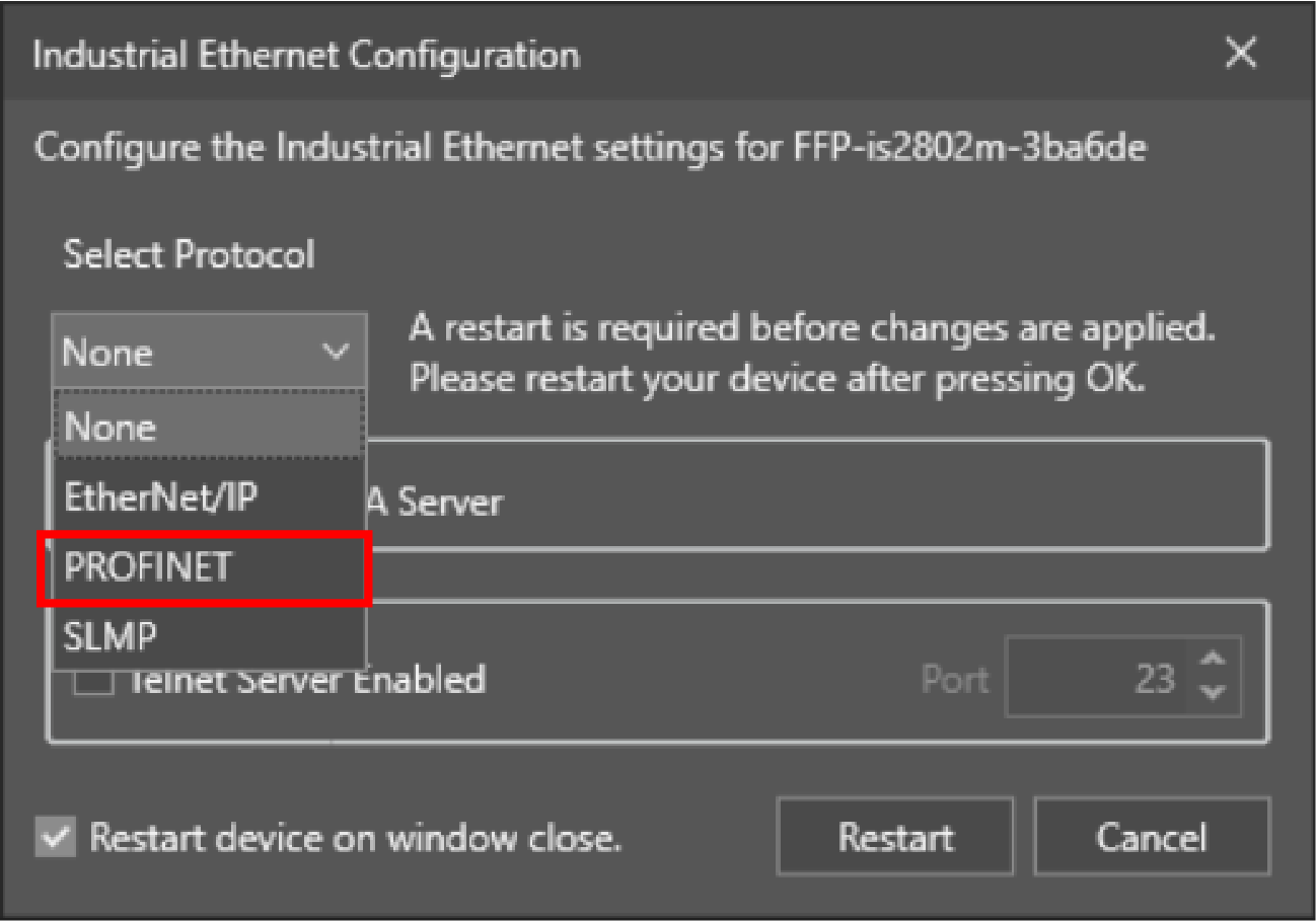 4. Select the PROFINET protocol from the dropdown list. Once selected, additional options appear in the window.