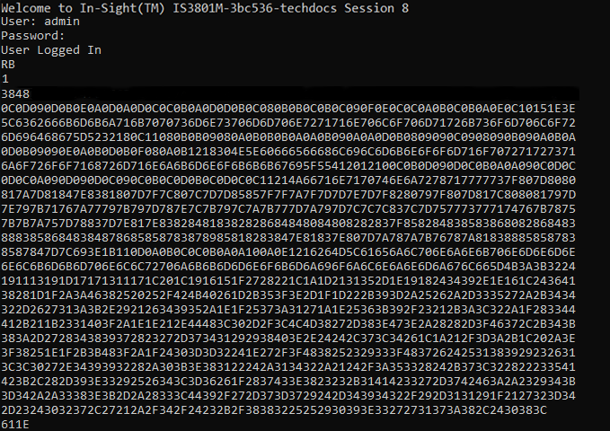 The In-Sight vision system initially responds with 1, indicating that the execution of the Read BMP command was successful. The next line contains the size (3848) in bytes, and the image data in ASCII hexadecimal format.