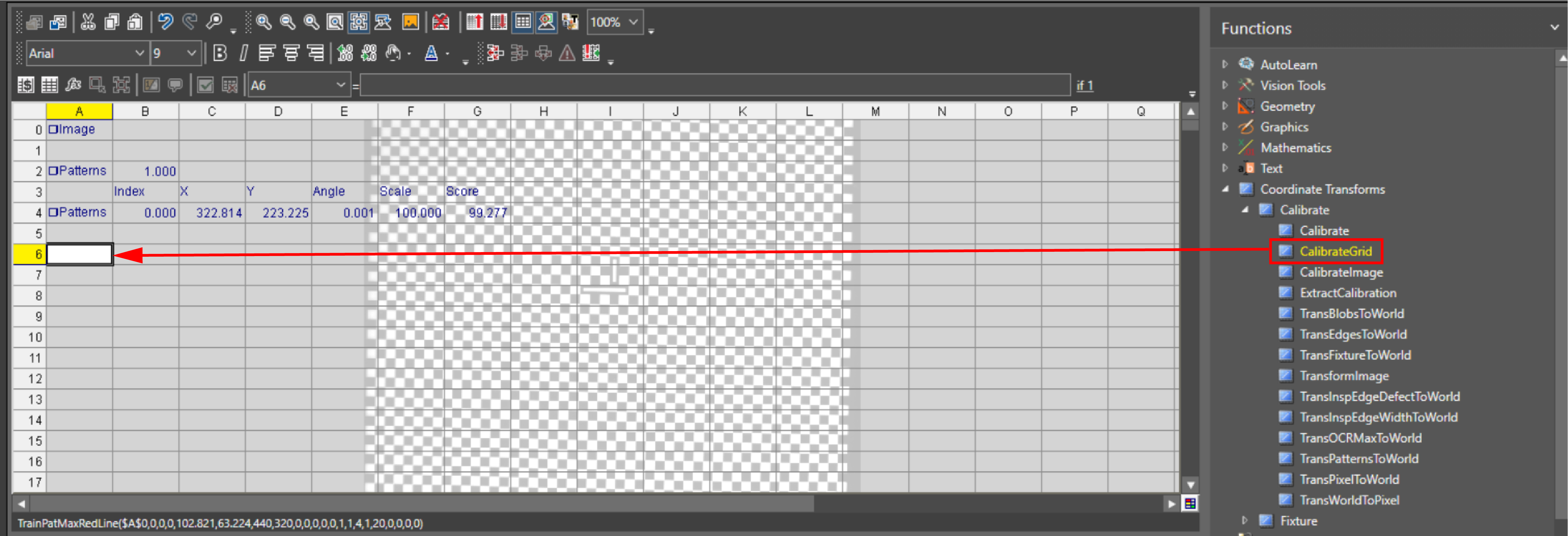 After the calibration is performed, the CalibrateGrid cell stores the calibration data. This allows you to copy the CalibrateGrid function from one job and paste to another, or export and import as an external file using Export Cell/Import Cell. It is possible to have a different calibration for each job, as well as multiple calibrations in a single job, if necessary. Other functions that use Calibrate functions as arguments can reference the CalibrateGrid data structure.