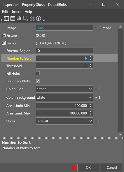 - Fixture: The default setting was used because the image is stationary and is not rotated or moved. However, when using the DetectBlobs function on images that undergo movement, it is advisable to assign the image region to a Fixture.