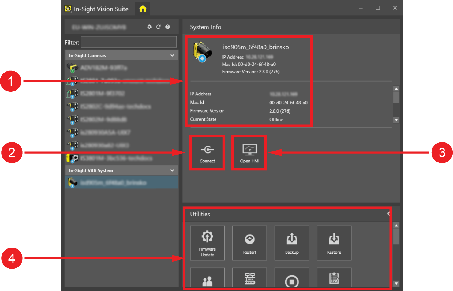 Utilities | Reveals the list of In-Sight® Utilities, allowing you to perform configuration, management or maintenance operations on the selected device(s). |