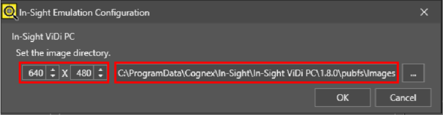 • If the In-Sight ViDi PC emulator is selected in the previous step, use the checkboxes on the left to select the number of cameras you want to use, then use the numeric entries on the left to configure the width and height resolution of the simulated cameras (in pixels). Afterward, configure the folder where the emulator images are stored either by modifying the path in the text box, or by browsing the folder with the Browse (...) button. Click OK when you are done.