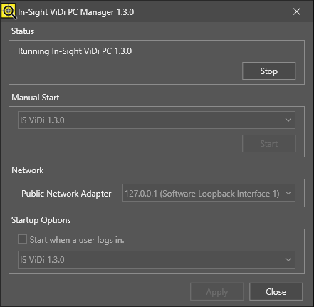 Note: If the In-Sight ViDi PC service is set to start automatically at login (with the Start when a user logs in checkbox of the In-Sight ViDi PC Manager dialog checked), and an In-Sight ViDi emulator is also set to start when launching In-Sight Vision Suite (with the Automatically run the emulator on startup checkbox of the Emulator Configuration dialog checked), then the In-Sight ViDi PC service always takes precedence over emulation.
