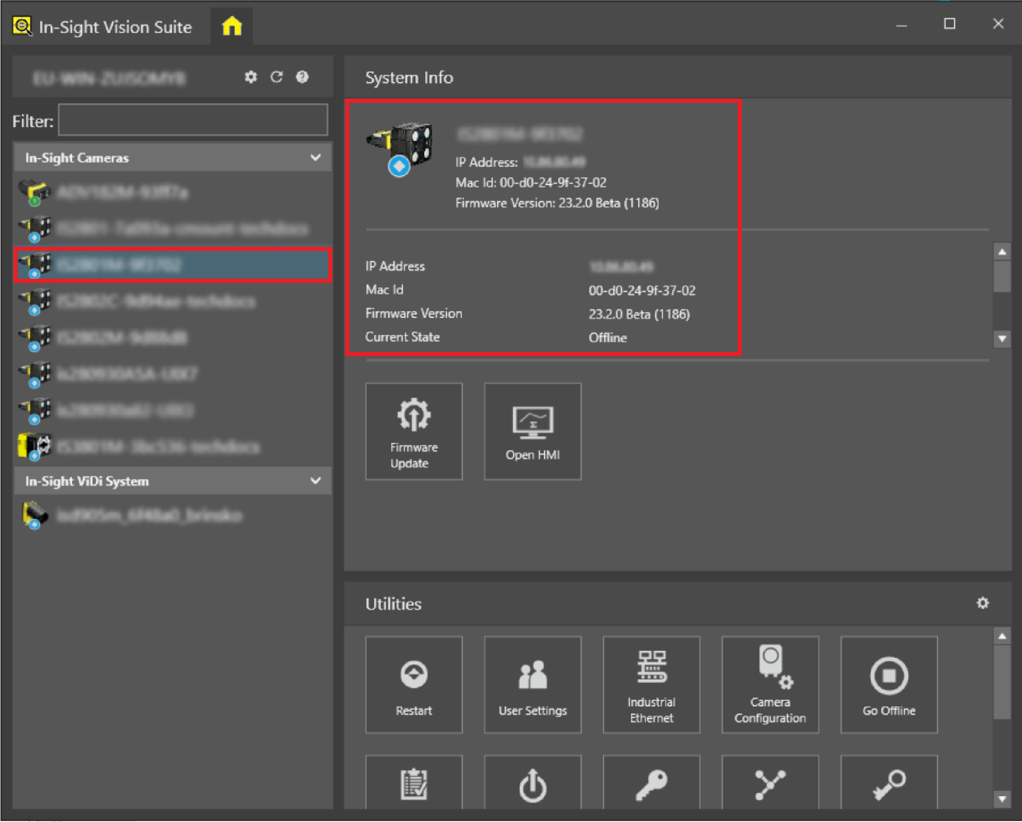 To display the device's system information and these buttons, simply select a device on the In-Sight® Device Pane by clicking on it. The System Info window then appears right to the Device Pane.