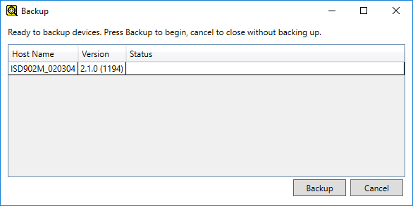 The Backup utility backs up the selected vision system(s). A backup creates a file which can be used to restore the device, containing all the necessary configurations and files to replicate it.