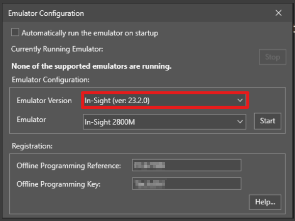 If you want to set the emulator so that it automatically starts when In-Sight Vision Suite is launched, check the Automatically run the emulator on startup checkbox, and then press the Start button.
