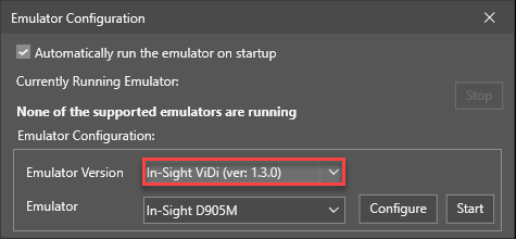 Note: In-Sight ViDi 1.8.0 only supports configuring and starting 1.8.0 emulators in the Emulator Configuration dialog. Use the standalone In-Sight ViDi 1.2.0 Emulator Configurator application to set up and start an In-Sight ViDi 1.2.0 emulator.