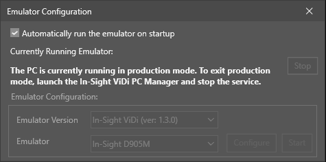 You cannot start the configured emulator if the In-Sight ViDi PC service is running on your PC in production mode. In such cases, In-Sight Vision Suite disables all buttons and drop-down lists of the Emulator Configuration and the In-Sight ViDi 1.2.0 Emulator Configurator windows, and shows the following status message: