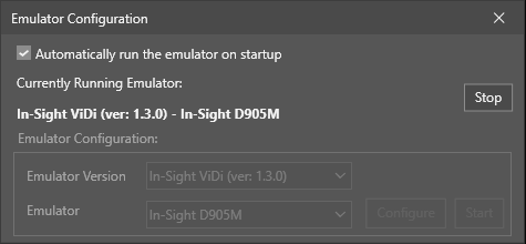 If you want to set the emulator so that it automatically starts when In-Sight Vision Suite is launched, check the Automatically run the emulator on startup checkbox, and then press the Start button.