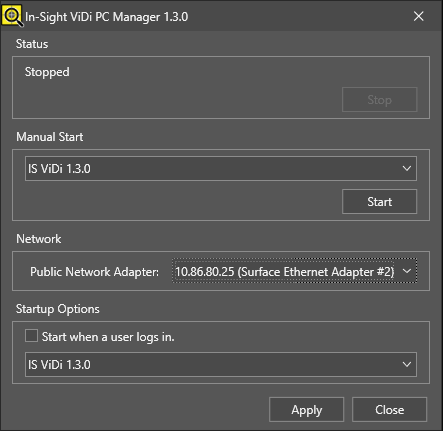 Note: If the In-Sight ViDi PC service is set to start automatically at login (with the Start when a user logs in checkbox of the In-Sight ViDi PC Manager dialog checked), and an In-Sight ViDi emulator is also set to start when launching In-Sight Vision Suite (with the Automatically run the emulator on startup checkbox of the Emulator Configuration dialog checked), then the In-Sight ViDi PC service always takes precedence over emulation.