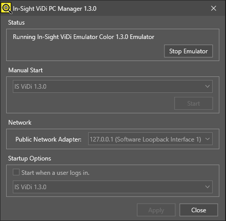If In-Sight ViDi PC is already running in emulation mode, you can switch to production mode by opening the In-Sight ViDi PC Manager, clicking the Stop Emulator button of the Status section, and then clicking the Start button in the Manual Start section. Afterward, make sure that the Automatically run the emulator on startup option is disabled in the Settings > Emulator dialog. See the Emulator topic for more information.