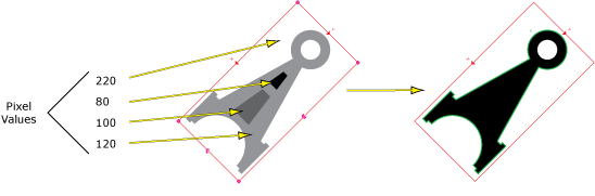 During this process, the pixels in the ROI are divided into two categories, Blob and Background, based upon the greyscale threshold value. This threshold value separates the pixels so that those pixels below the threshold value are categorized as Black, and those values over the threshold are categorized as White.