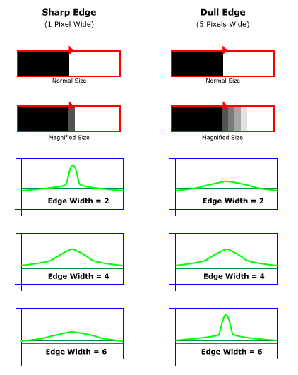The Edge Width parameter is used to remove noise from the input image, and accentuate the peaks of the edge profiles. The size of the Edge Width parameter should be specified such that the size closely matches the size of the edges in the image, and the peak is sharp and steep, versus low and gradual. The size of an edge is how many pixels wide the edge is. An edge can be sharp, in which case the edge only spans a pixel or two, or edges can be dull, in which case they might span several pixels. Specifying an Edge Width setting that is close to the edge size allows the function to produce stronger edge peaks in the image. Whereas specifying an Edge Width setting that is too large or too small will produce broad, low peaks in the image.