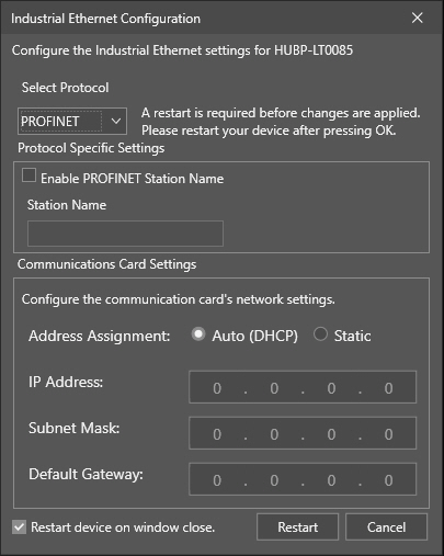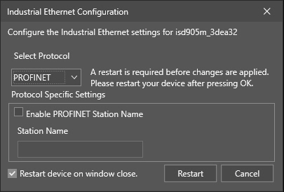 When the PROFINET protocol is selected, the Industrial Ethernet Configuration window changes to display PROFINET-specific options.
