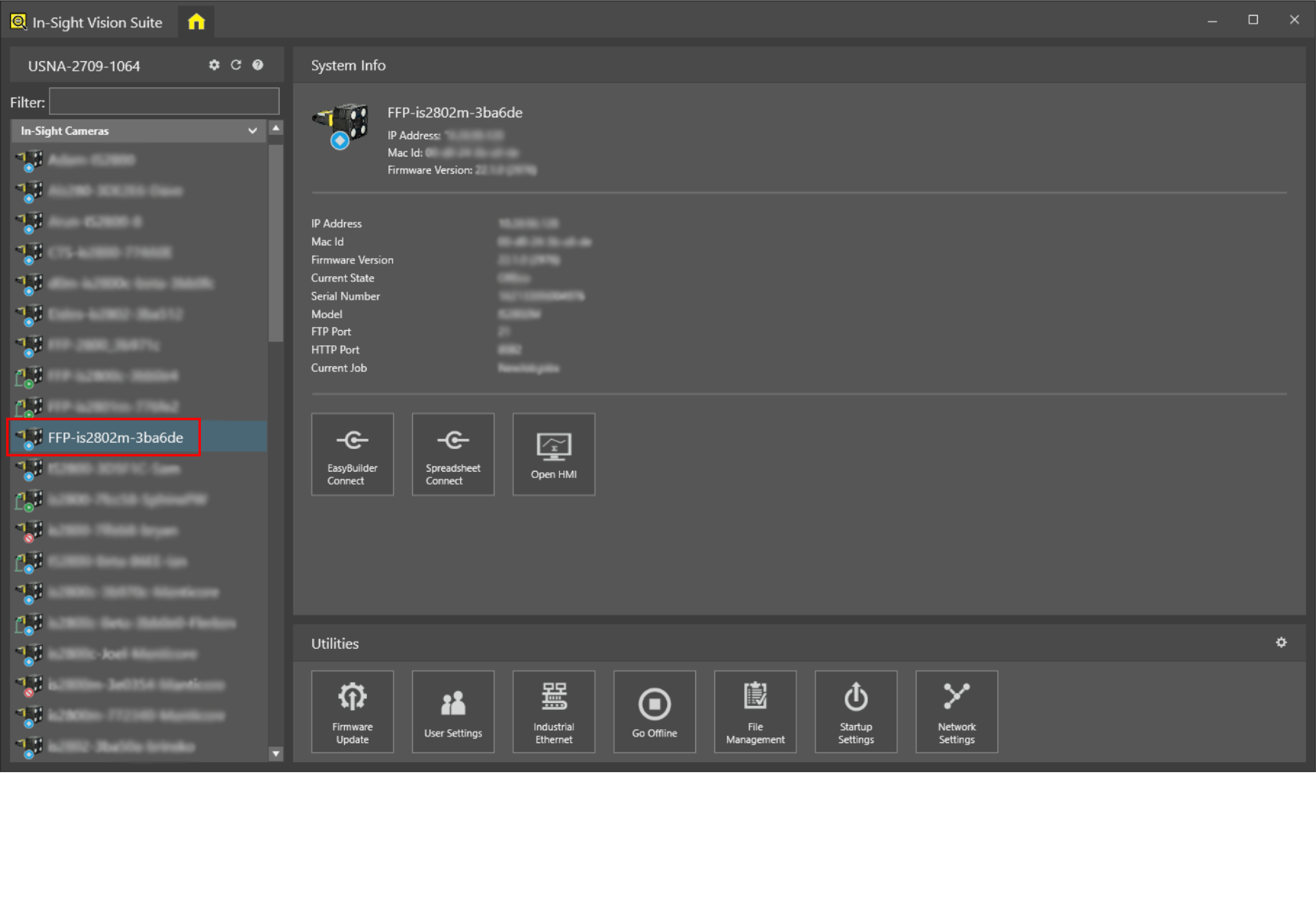 3. Once the vision system is selected, the available utilities appear at the bottom of the In-Sight Vision Suite window. Click Industrial Ethernet to launch the Industrial Ethernet configuration utility.