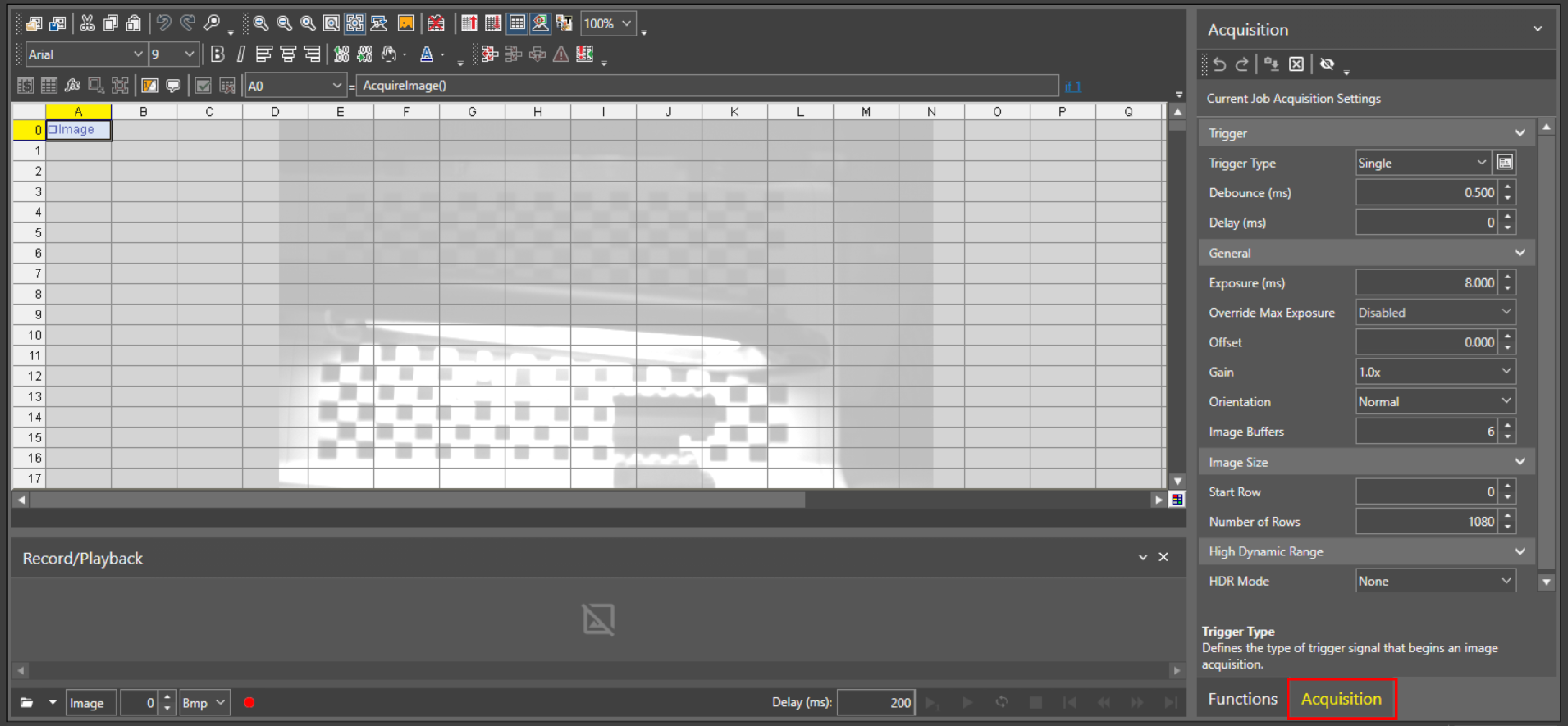 To change the parameters for AcquireImage, click the Acquisition panel next to the Spreadsheet.