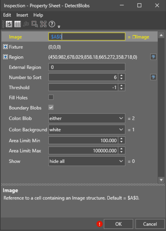 - Fixture: The default setting was used because the image is stationary and is not rotated or moved. However, when using the DetectBlobs function on images that undergo movement, it is advisable to assign the image region to a Fixture.