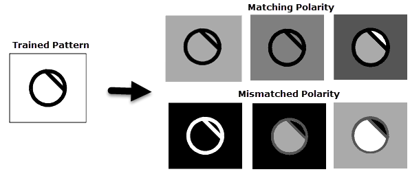 Ignoring Polarity increases the variety of patterns that PatMax finds. Figure below shows some examples of matched and mismatched polarities. If you configure PatMaxRedLine to ignore polarity, it finds all of the patterns shown in the figure. If you configure PatMaxRedLine to consider polarity, it might not find the pattern in the bottom row, or it might find them but assign them lower scores than the patterns in the upper row.