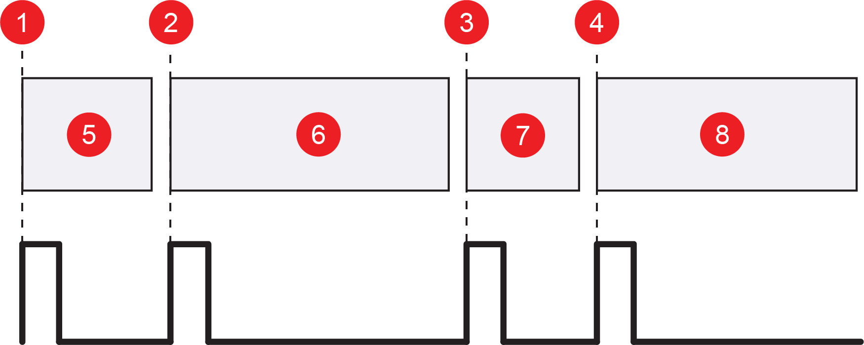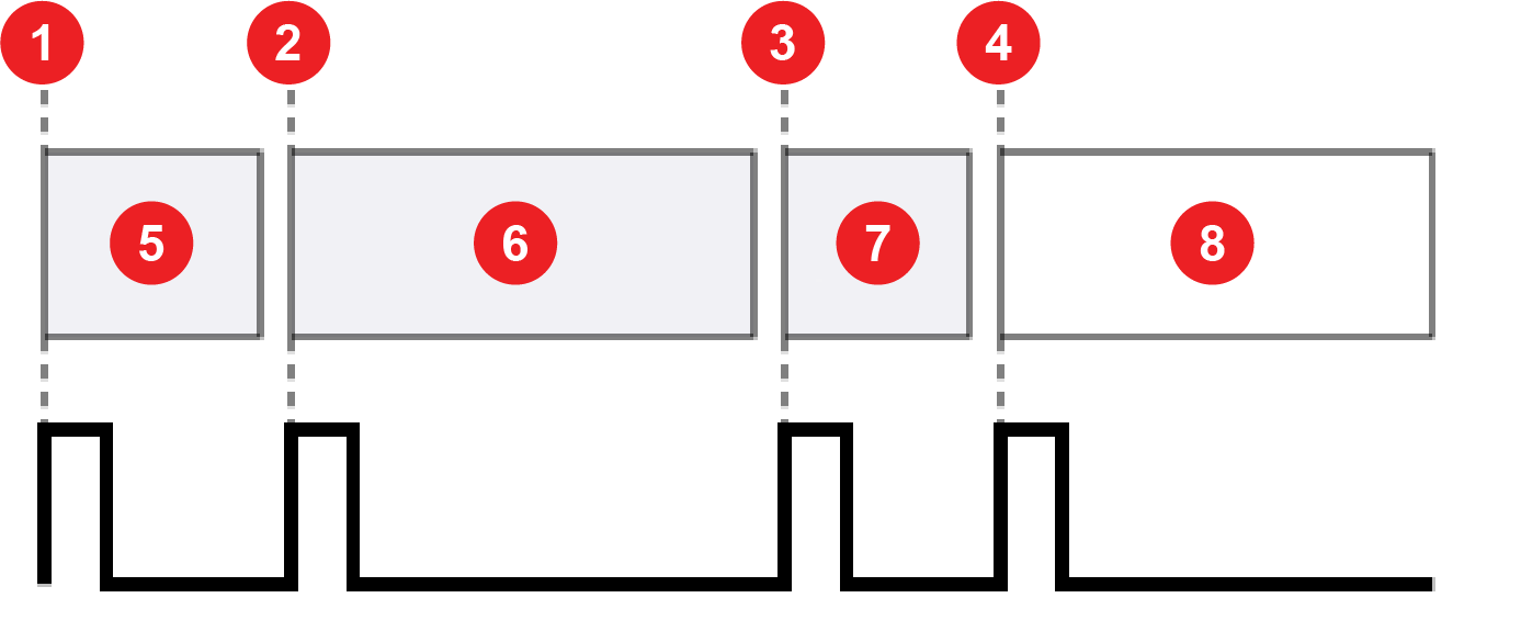 Defines the number of encoder steps for each image line. A step is a complete cycle of the encoder signal or signals, depending on the encoder you use. For a single-line hardware encoder, a complete cycle is equivalent to two signal transitions. For a quadrature hardware encoder, a complete cycle is equivalent to four signal transitions. The following image shows how steps per line correlate to signal transition for different encoders: