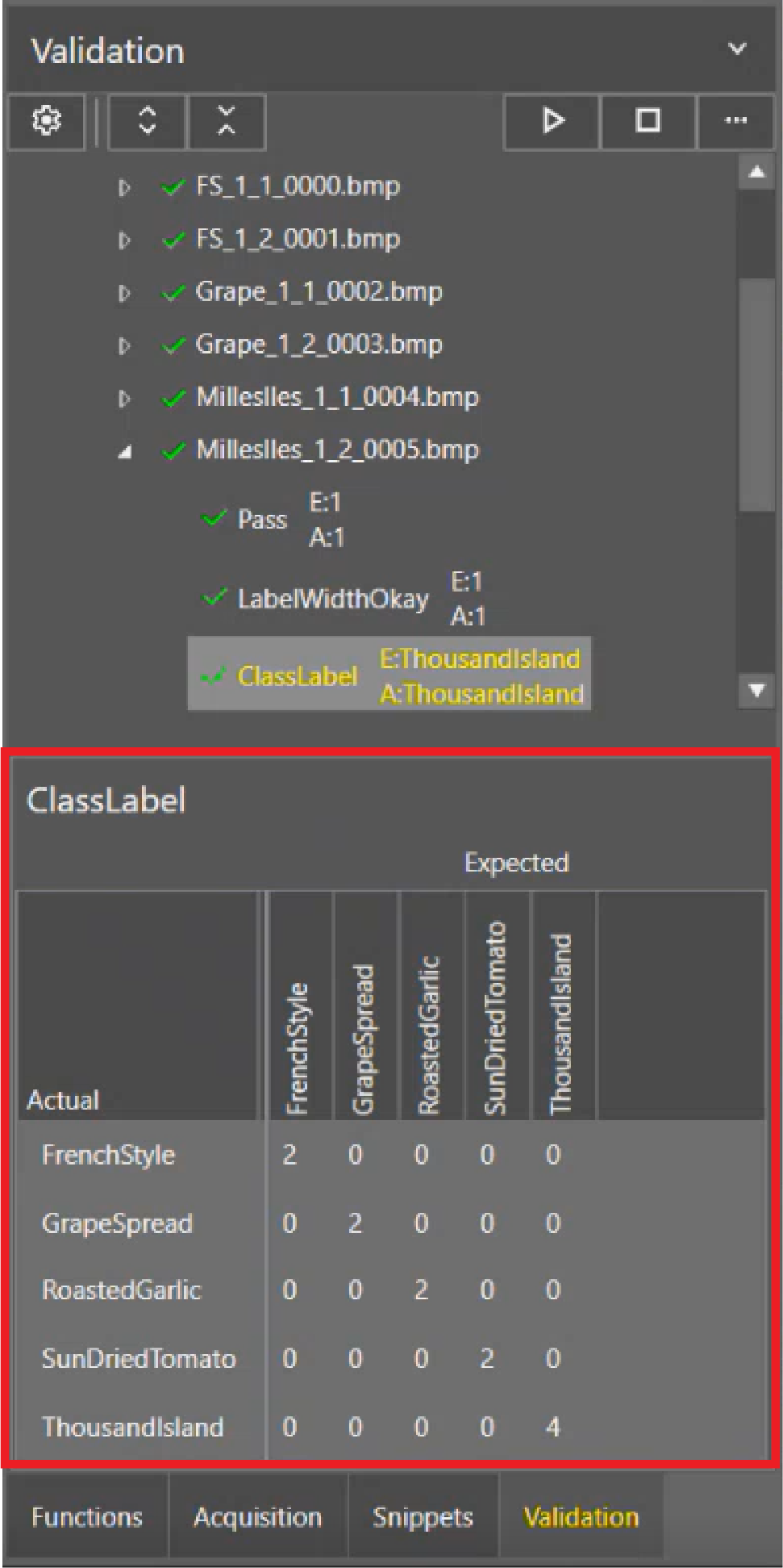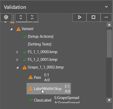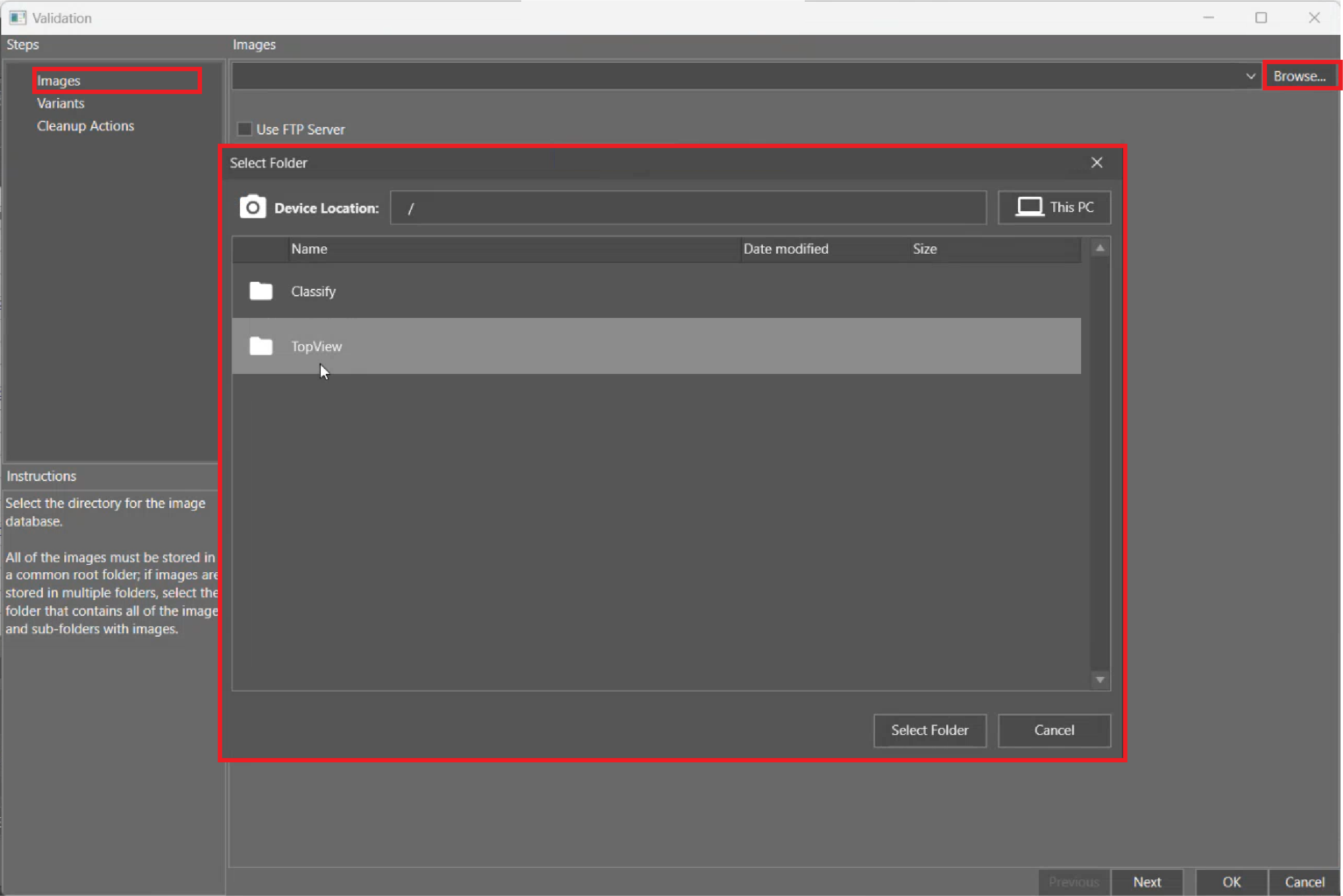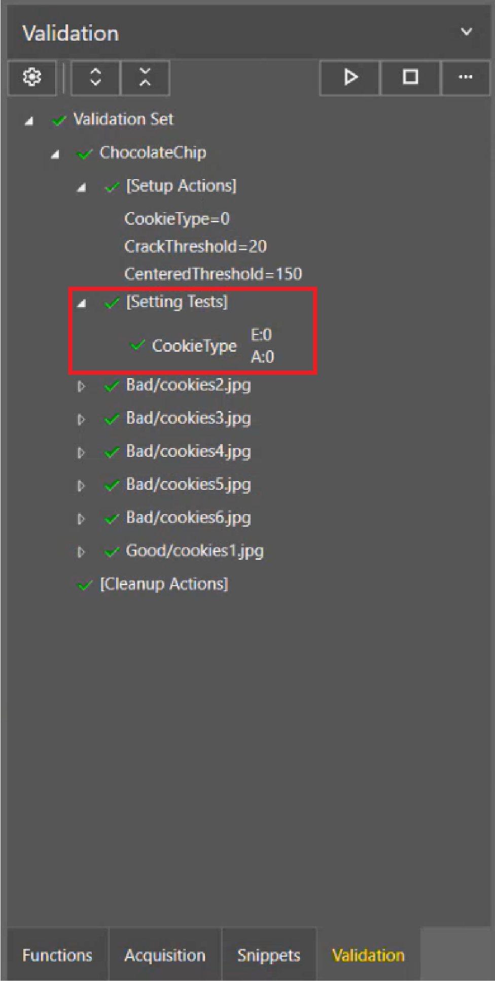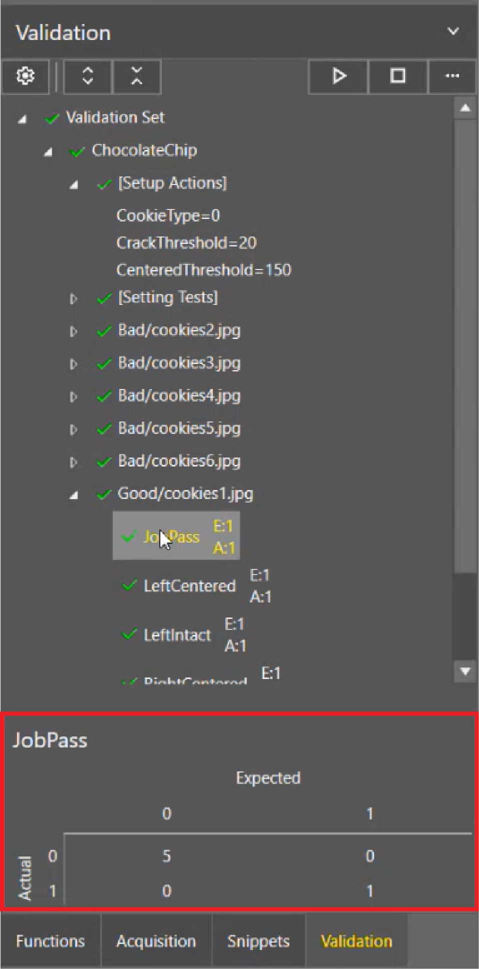 Note: When configuring Job Validation for the first time, Cognex recommends storing test images on the device using the WriteImage function Functions are tools that are available in Spreadsheet for processing and analyzing acquisitions or other results. You can add functions to your Spreadsheet job to create tool chains and produce results for specific applications.. For more advanced usage, you can also store test images on an external FTP server.Note: Ideally, include examples of "good" images that result in a Pass, and "bad" images that result in a Fail. Job Validation is able to operate with a variety of file organization structures for the image database, however, sorting the images into separate "good" and "bad" folders before launching Job Validation simplifies the process.