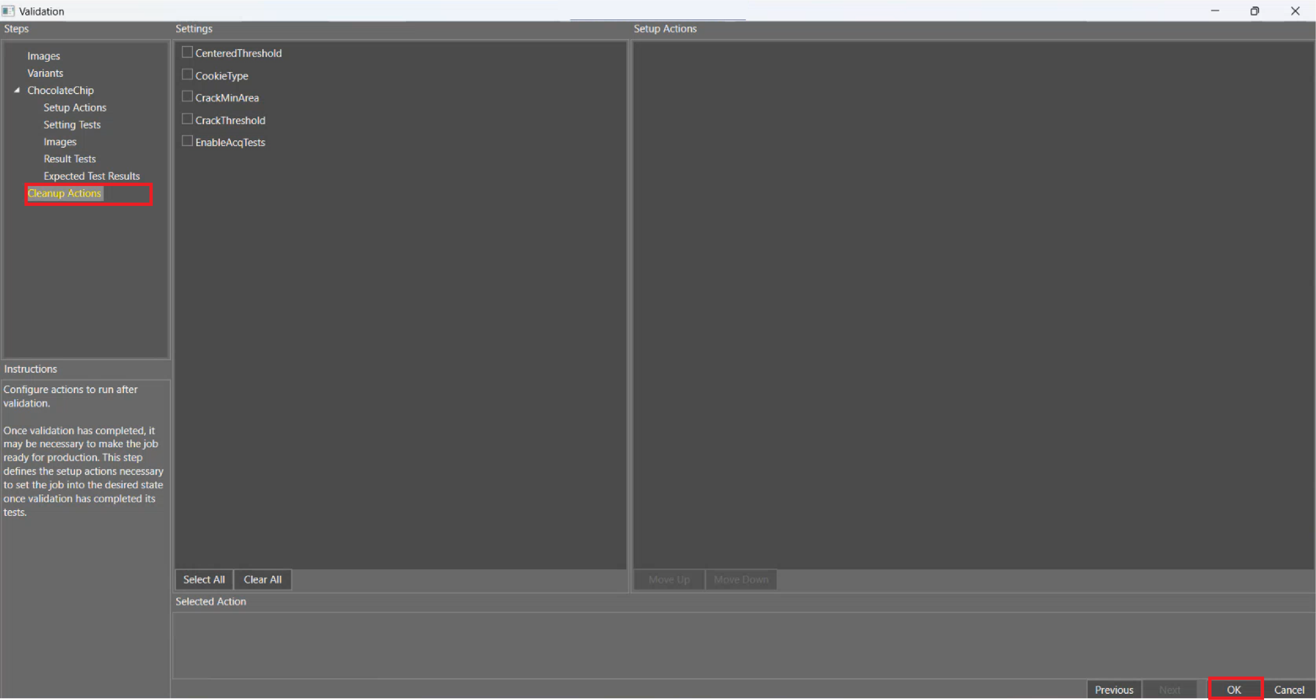 The Cleanup Actions restore the job to a constant state. For example, when processing a large number of images, counters in a job can increment, which should not be included in production results. Cleanup Actions can reset the counters.