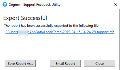 The Support Feedback utility (also known as the Report a Problem utility) prepares error reports for potential issues encountered when using a Cognex vision system or software, and helps you sending those reports to Cognex Support for troubleshooting.