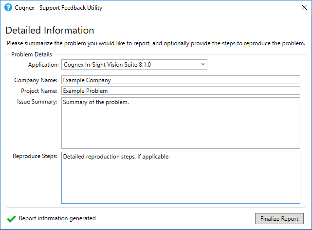 5. While filling the textboxes, the Support Feedback utility automatically collects troubleshooting data, indicated with the Gathering report information status message. The time of generating the report depends on the number of Cognex software installed on the PC (and consequently, the number of logs), and may take from approximately 30 seconds to several minutes. Once the report is generated (indicated with the Report information generated status message), and you finished filling the Problem Details textboxes, click the Finalize Report button.