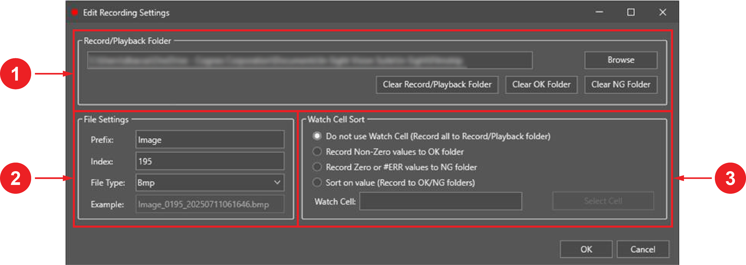 Provides options to specify the directory on the computer for storing recorded images. To select the directory, click Browse. When conditional sorting is enabled, the OK and NG folders are created as subdirectories of the Record/Playback folder. The following additional options are available: