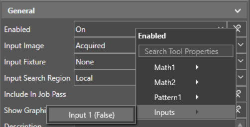 For example, if you want to enable or disable a Find Pattern tool in your job using an input line, set your input line to User Data. Then, in the advanced tool settings view for the Find Pattern tool, open the tool property linking dropdown next to Enabled, and select your input line from the Inputs category:
