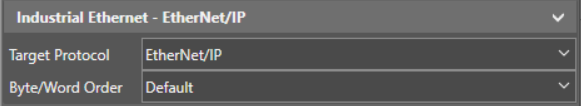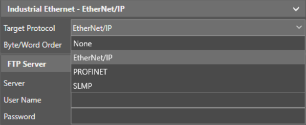 - Industrial Ethernet settings allow you to set up an input and output stream over Ethernet/IP, PROFINET, or SLMP.