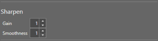 Adjust the Gain parameter (0 - 10, default = 1) to change the strength of the sharpening. The Gain parameter defines the amount of difference between pixels that the Sharpen filter can ignore, ensuring that lightly textured areas are not over-sharpened. Adjust the Smoothness parameter (1 - 4, default = 1) to change the standard deviation of the Gaussian kernel that the Sharpen filter applies to the pixels as a weighted average. A higher smoothness value provides a wider aperture, helping sharpen features. |