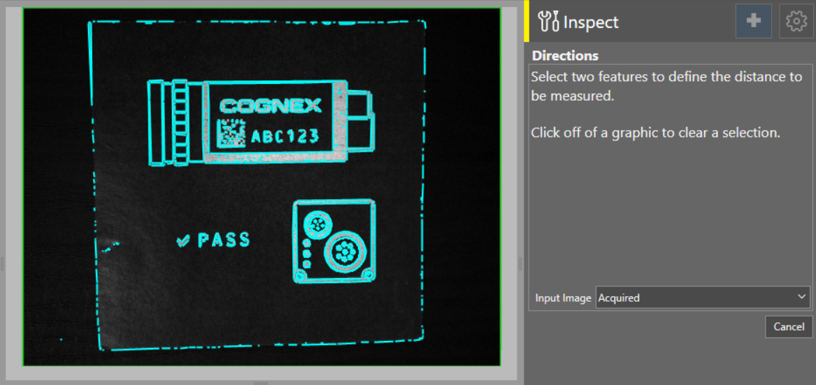 In the dialog, select the two input features between which you want to measure the distance. The tool automatically finds possible measurement targets based on your image and already added tools, and highlights them in light blue on the acquisition display screen. Click on a highlight to select it as an input feature.