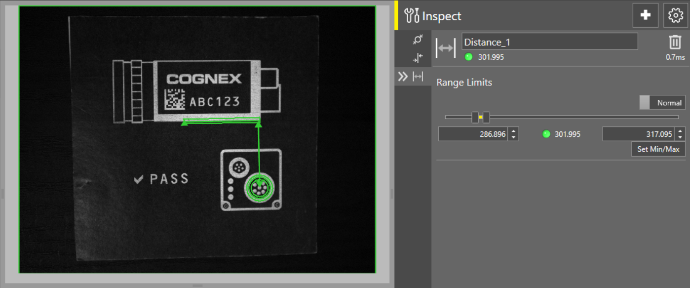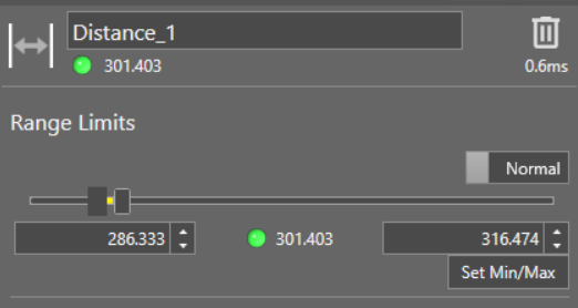 Toggle the Normal/Inverted toggle to change the way the tool result is generated. If set to Normal, the tool produces a passing result if the distance value falls between the defined minimum and maximum values. If set to Inverted, the tool produces a passing result if the distance value falls outside the defined minimum and maximum values.