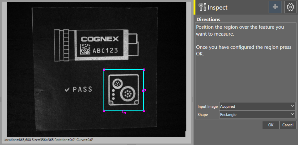 - 在出现的对话框中,通过在采集显示屏幕上调整框的大小和重新定位来定义区域。您可以使用右侧的搜索图形下拉菜单更改这个框的形状。可用形状包括矩形、圆、环形和多边形。